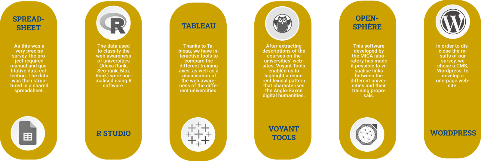 We used a variety of tools during the course of this project to make the most of our database. Firstly, the first version of this database was built on a Google Spreadsheet shared between all students. For the processing of specific aspects, R was used, as well as Prepost SEO and SEO Rank, respectively to obtain the Alexa and Moz Rank. Finally, AirTable and Opensphere were used to create the DHsphere. The infographic below allows you to see the different tools (common to all and specific to our group) that we used to accomplish this project.