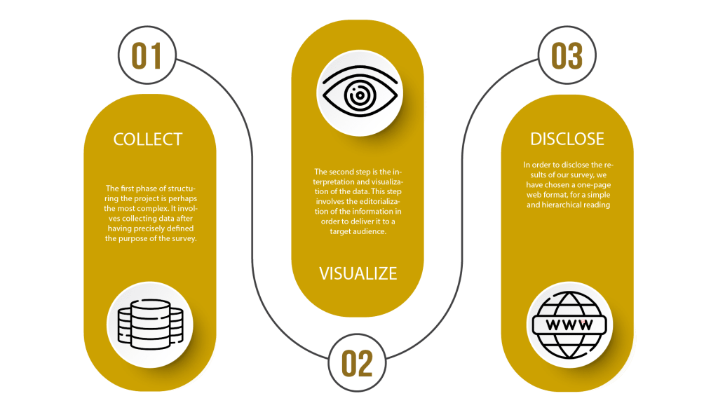 In the first part, we sought to obtain the most relevant database possible. We reworked the topic, its approach and the database with the teachers, using various tools. We also established our first ideas for the final visual of the website, as well as learned other tools to develop our skills in several areas such as: webdesign, data processing, data visualisation, etc. The writing of the textual contents was also done with all the students, so that our realisations would be coherent despite the possible graphic differences.